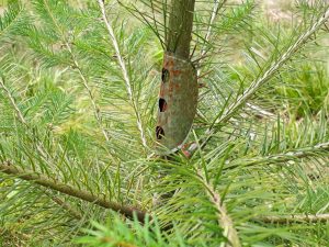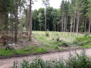 heute eine kleine Forstexkursion. Unser Lehrrevier Schopfheim Entegast ist ein reines Waldrevier, was bedeutet, dass wir keine landwirtschaftlich, sondern nur forstwirtschaftlich genutzte Flächen haben. Somit liegt unser Fokus auf der Entwicklung der jungen Bäume, seien es naturverjüngte oder von forstlicher Hand gepflanzte. Rehwild verbeißt gerne die Triebe der jungen Pflanzen und kann diese dadurch erheblich in ihrem Wachstum schädigen. Die jungen Bäume werden jedoch nicht nur verbissen, sondern auch durch den Rehbock verfegt. Hiermit markiert er unter anderem seinen Einstand. Auf den Fotos seht ihr eine Metallklammer an einer jungen Douglasie. Diese dient als Einzelschutz vor Fegeschäden. Ein anderer effektiver Schutz gegen die genannten Schäden auf den jungen Kulturen, ist die intensive Bejagung des Rehwildes auf diesen Flächen. Deswegen seht ihr auch den Hochsitz gegenüberliegend der zu schützenden Douglasienfläche auf den Fotos.